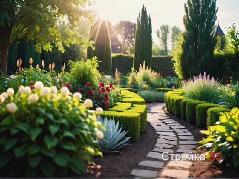 При планировке важно учитывать высоту и форму кроны. Высокие деревья формируют фон и защищают зону отдыха от ветра. Среднерослые кустарники создают плавный переход между деревьями и низкими растениями, а почвопокровные культуры завершают композицию, связывая все элементы участка в единое целое.